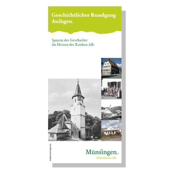 Auingen wurde 770 erstmals erwähnt im Urkundenbuch des Klosters Lorsch. Die erste Ansiedlung des Straßendorfs dürfte an der reich schüttenden Quelle am Kirchenrain verortet sein, aus der im Lauf der Jahrhunderte auch mehrere Brunnen gespeist wurden. Zahlreiche bronzezeitliche Gräberfunde (2000 – 800 v. Chr.), ein keltisches Grab aus der La-Tène-Zeit (3./2. Jhd. v. Chr.) und ein alemannisches Gräberfeld (3./4. Jhd.) weisen auf eine sehr frühe Besiedlung hin. Um 1265 kam Auingen zusammen mit Münsingen an Württemberg. Im Dreißigjährigen Krieg wurde das Dorf bis auf drei Häuser und noch einmal 1704 während des spanischen Erbfolgekriegs bis auf vier Häuser und die Kirche niedergebrannt. Mit der Anlage des Truppenübungsplatzes verlor Auingen fast ein Drittel seiner Gemarkung. Die bäuerliche Struktur ging weitgehend verloren, es entstanden aber neue, bisher in der Gemeinde nicht bekannte Berufsbilder und Arbeitsmöglichkeiten. Die Einwohnerzahl stieg beträchtlich. Handwerksbetriebe und Handelsgeschäfte, neue Gastwirtschaften und andere kleinere Gewerbebetriebe wurden gegründet. Durch die Verwaltungsreform in Baden-Württemberg verlor Auingen seine Eigenständigkeit. Die Gemeindereform begann in Münsingen mit der Neubildung der